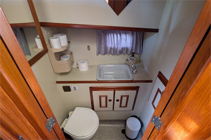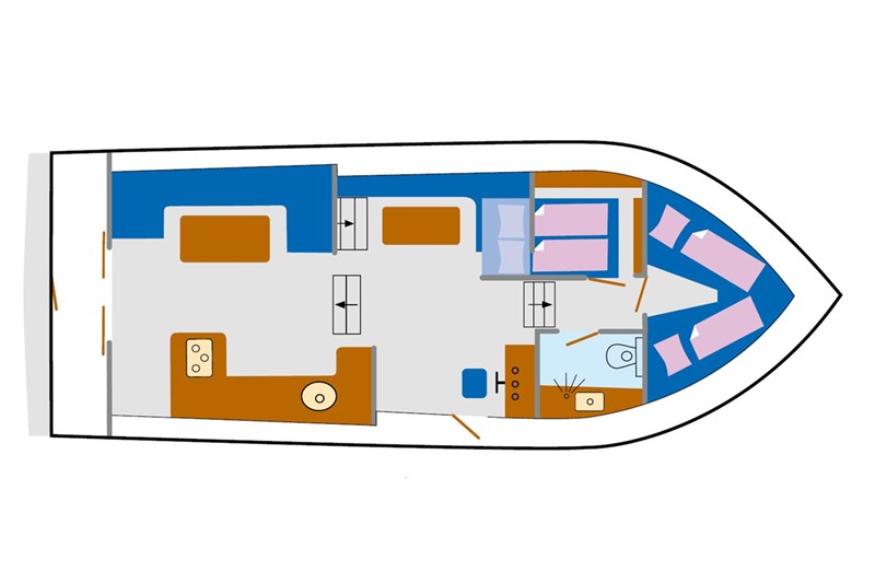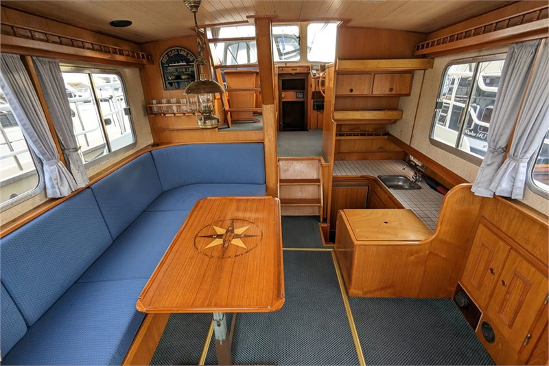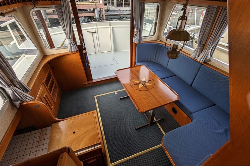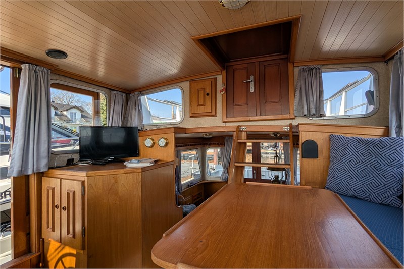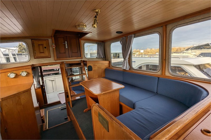 Großer Salon auf zwei Ebenen mit einer Sitzgruppe als Esstischbereich und eine gemütliche zweite Sitzgruppe für gemütliche Abendstunden bis zu acht Personen. Pantry im Achterteil des Salon. Komplett ausgestatteter Innensteuerstand mit guter Rundumsicht. Unterflurkabine als Eignerkabine mit Doppelbett, Schränken und Luken (sehr gemütlich). Nasszelle mit Toilette, Waschtisch und Dusche. Bugkabine mit V-Koje und Schränken. Vom Salon gelangt man bequem zur Flybridge mit zweitem Steuerstand, zur Gangbord oder durch eine sehr breite Achtertür in die Plicht.